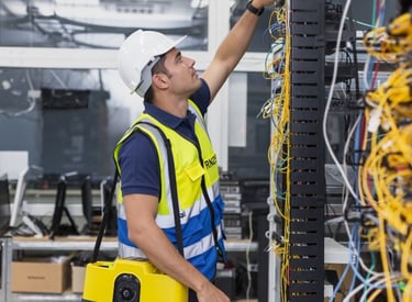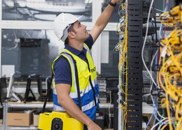 Tirage de câbles fibre et RJ45, raccordement optique et cuivre, installation et brassage de baies informatiques.